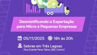 A Prefeitura de Três Lagoas, por meio da Secretaria Municipal de Desenvolvimento Econômico, Ciência, Tecnologia e Turismo (SEDECT) é parceira do SEBRAE no workshop “De Pequeno a Global: Desmistificando a Exportação para Micro e Pequenas Empresas”, que será realizado nesta quarta-feira, 05 de novembro de 2025, às 18h, no SEBRAE Costa Leste, localizado na Rua