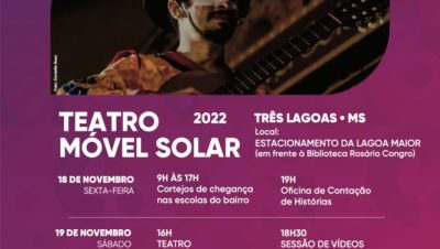 Com programação acessível e valorização da Cultura Local, o Teatro Móvel autossuficiente em energia chega a Três Lagoas, nos dias 18 e 19 (sexta-feira e sábado), em seis apresentações gratuitas no estacionamento da Lagoa Maior, em frente a Biblioteca Municipal. O espetáculo “Teatro Móvel Solar” integra o programa Diversão em Cena promovido pela Fundação ArceloMittal