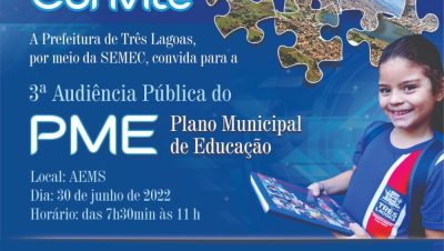 A Prefeitura de Três Lagoas, por meio da Secretaria Municipal de Educação e Cultura (SEMEC), realizou na manhã da última quinta-feira (30), no auditório da AEMS, a terceira Audiência Pública de Avaliação e Monitoramento do Plano Municipal de Educação, para divulgar o Relatório Bienal 2020/2021 previsto na Lei Municipal nº 2925/2015.De acordo com a Secretária