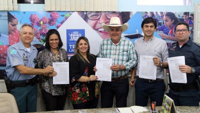 O prefeito de Três Lagoas, Angelo Guerreiro, recebeu na última sexta-feira (12), o comandante Major Ênio de Souza Soares e Sargento Jefferson Barbosa de Paula, do 2º Batalhão de Polícia; ao lado do vice Paulo Salomão; da secretária de Educação e Cultura (SEMEC), Heliety Antiqueira e da diretora Educacional e Pedagógica, Angela Brito, para tratarem