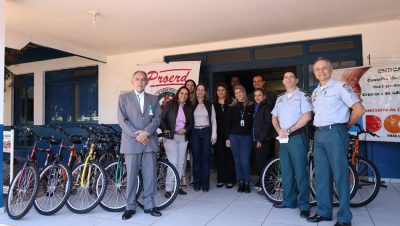 O comandante do 2º Batalhão de Polícia Militar (2ºBPM), major Ênio de Souza Soares, acompanhado do sargento Jefferson de Paula, instrutor do Programa Educacional de Resistência às Drogas e à Violência (PROERD) de Três Lagoas, recebeu formalmente a doação de 14 bicicletas, na manhã desta terça-feira (10).