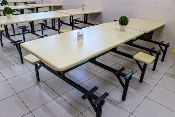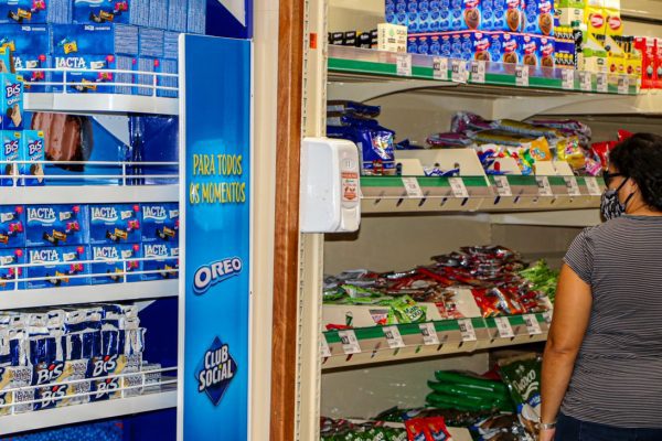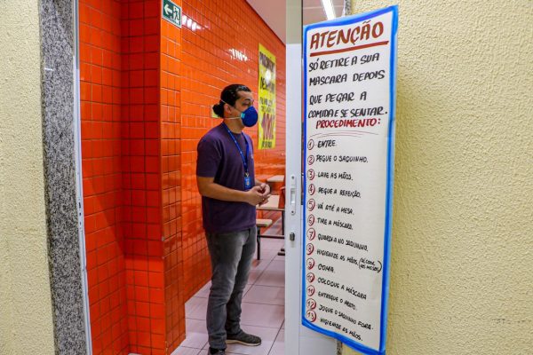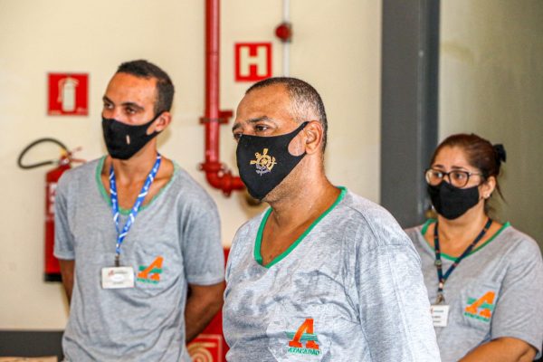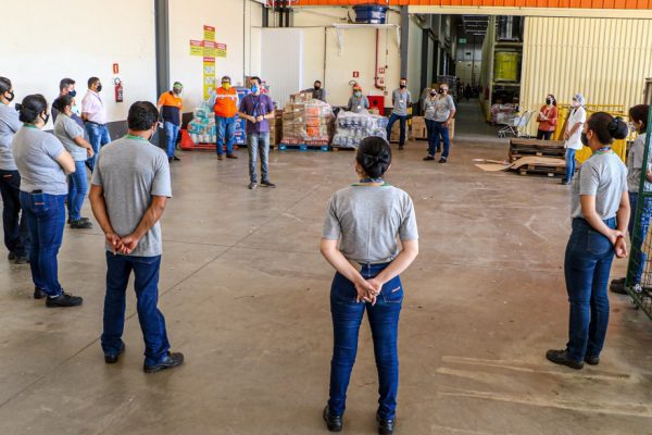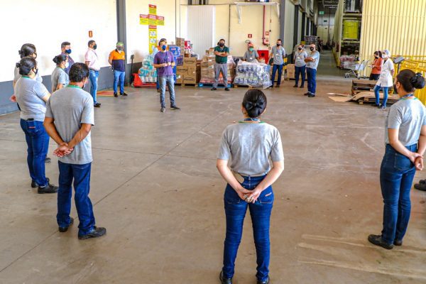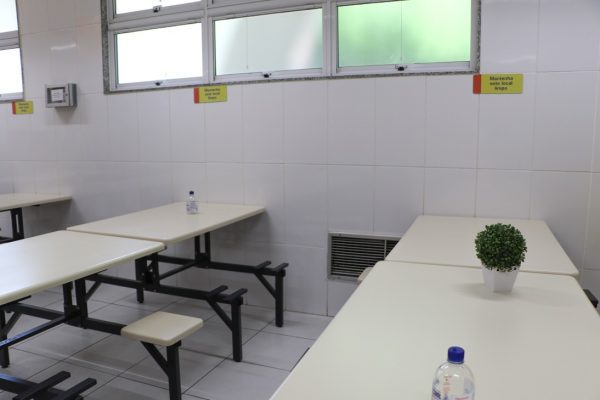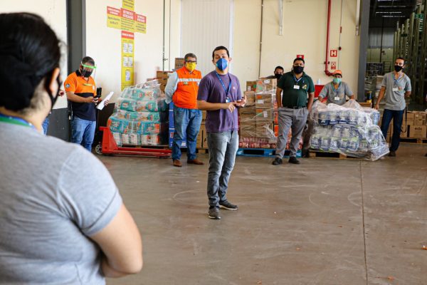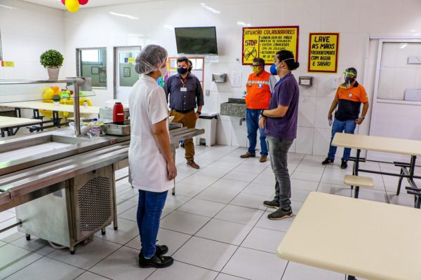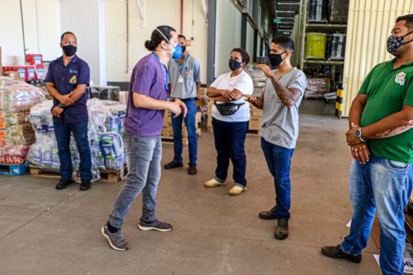 Acompanhando a equipe o gerente do Atacadão Edvaldo e a nutricionista Ana Paula mostraram o local em que os funcionários almoçam e lancham mostrando os cuidados que a empresa está tendo com seus servidores (com avisos, regras e adaptações para manter o distanciamento recomendado) e com os clientes oferecendo recipientes de álcool em gel em todos os corredores da loja.