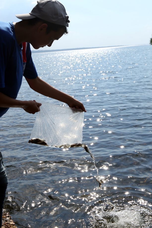 Cerca de 120 mil alevinos foram soltos na última sexta-feira (29) no Condomínio Residencial Encontro das Águas (Vila Operadores) por alunos de 13 a 16 anos da Escola Municipal Professora “Maria Eulália Vieira”. A ação faz parte do Programa Ambiental da CTG Brasil em comemoração ao Dia Mundial da Água.