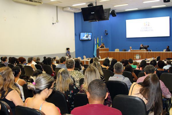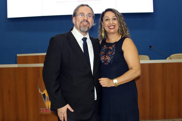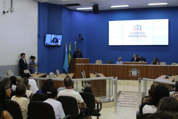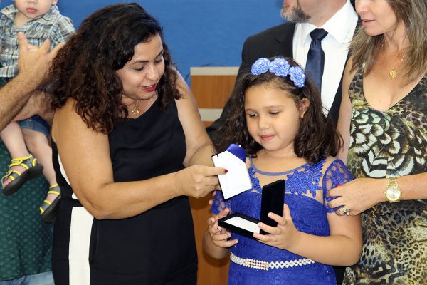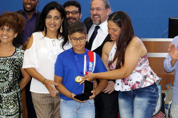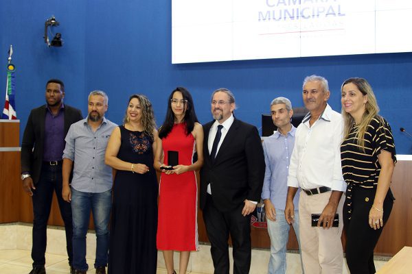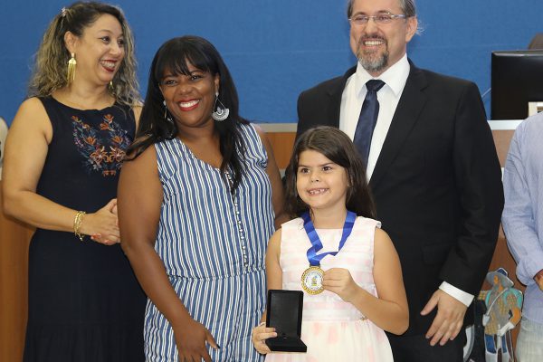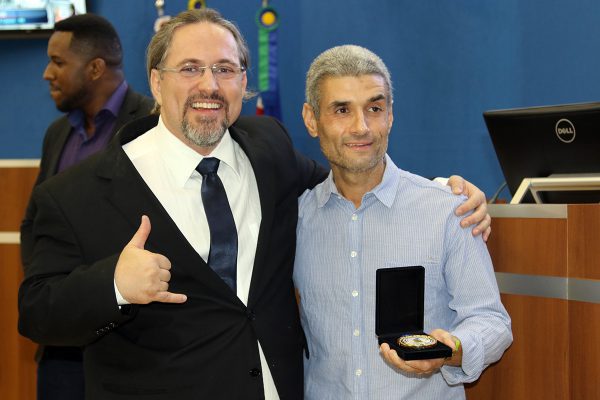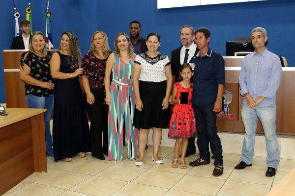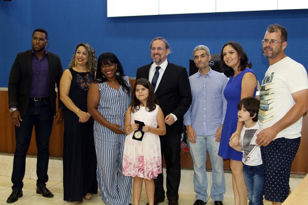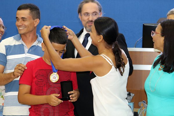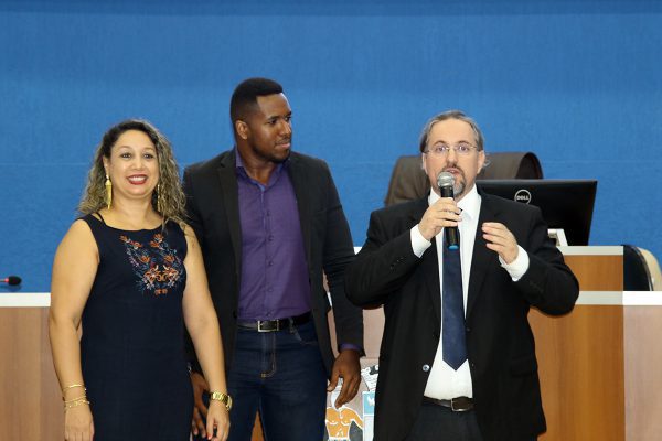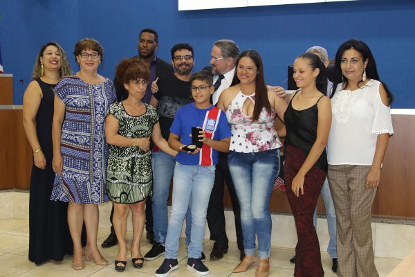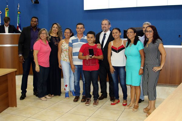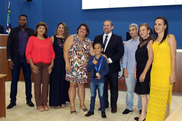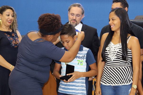 André, filho da professora homenageada pelo autor do projeto vereador Professor Flodoaldo, participou da entrega das medalhas na Câmara Municipal