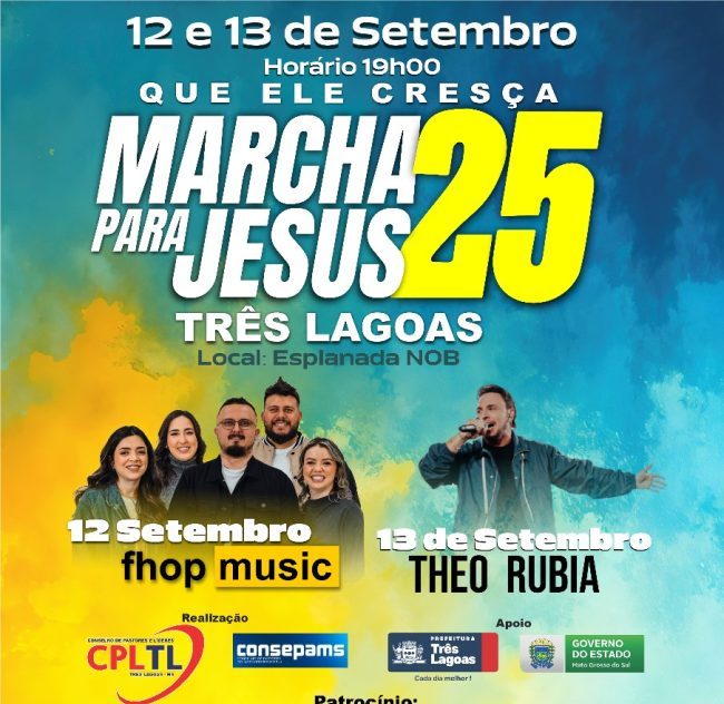 A 7ª edição da Marcha para Jesus, com o tema “Que Ele Cresça”, começa amanhã, 12 de setembro, e se estende até o dia 13, sábado, e tem o objetivo de reunir a comunidade cristã de Três Lagoas em uma programação de louvor e confraternização. O evento ocorrerá na Esplanada NOB, a partir das 19h, e contará com diversas atrações musicais, além da tradicional marcha.