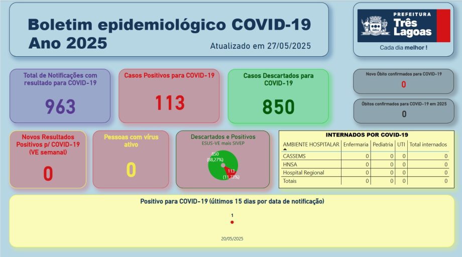 A Prefeitura de Três Lagoas, por meio do setor de Vigilância Epidemiológica da Secretaria Municipal de Saúde (SMS), divulga o Boletim Covid-19.