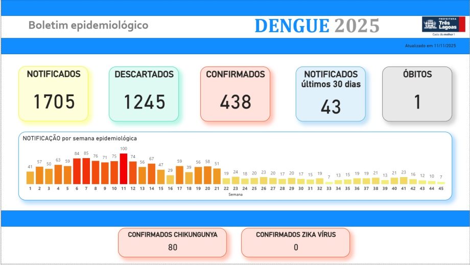 A Prefeitura de Três Lagoas, por meio do setor de Vigilância Epidemiológica da Secretaria Municipal de Saúde (SMS), divulga o Boletim Dengue.