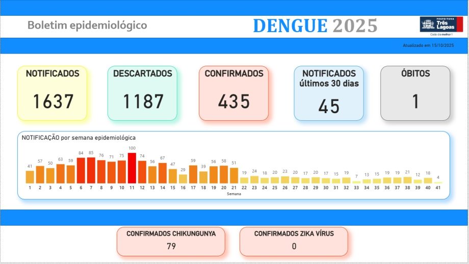 A Prefeitura de Três Lagoas, por meio do setor de Vigilância Epidemiológica da Secretaria Municipal de Saúde (SMS), divulga o Boletim Dengue.