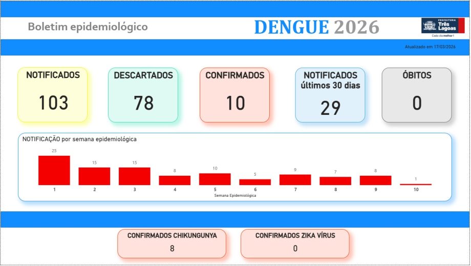 A Prefeitura de Três Lagoas, por meio do setor de Vigilância Epidemiológica da Secretaria Municipal de Saúde (SMS), divulga o monitoramento da Dengue e Leishmaniose.