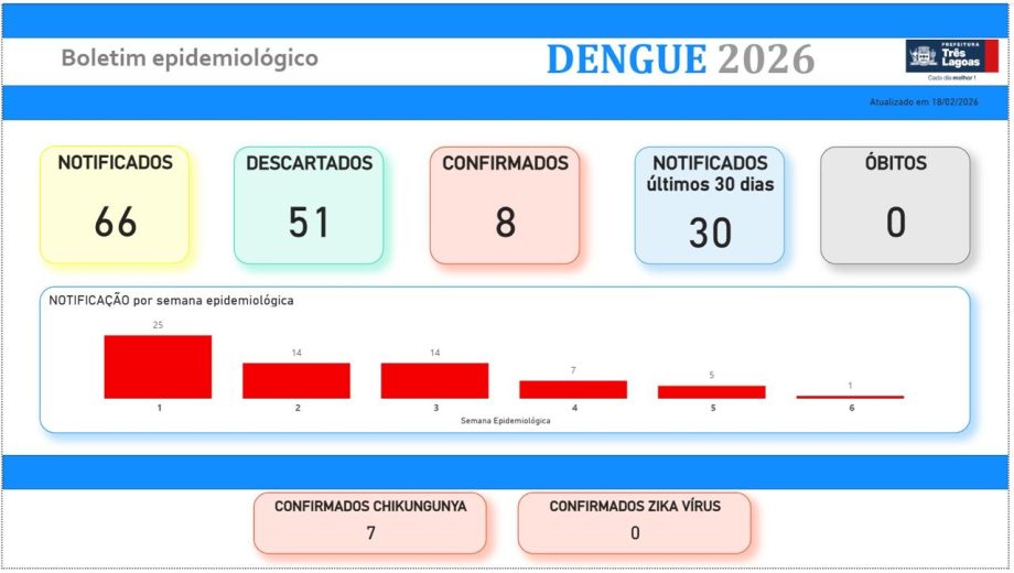 A Prefeitura de Três Lagoas, por meio do setor de Vigilância Epidemiológica da Secretaria Municipal de Saúde (SMS), divulga o Boletim Dengue.