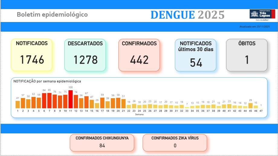 A Prefeitura de Três Lagoas, por meio do setor de Vigilância Epidemiológica da Secretaria Municipal de Saúde (SMS), divulga o Boletim Dengue.