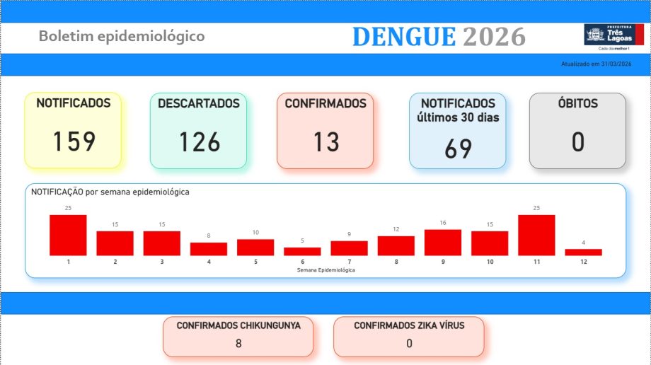 A Prefeitura de Três Lagoas, por meio do setor de Vigilância Epidemiológica da Secretaria Municipal de Saúde (SMS), divulga o monitoramento da Dengue e Leishmaniose.