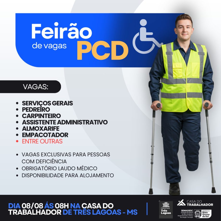 A Casa do Trabalhador de Três Lagoas promoverá, no próximo dia 8 de agosto, a partir das 8h, um Feirão de Vagas exclusivo para Pessoas com Deficiência (PCD). A iniciativa tem como objetivo ampliar as oportunidades de inclusão no mercado de trabalho e facilitar o acesso às vagas disponíveis.