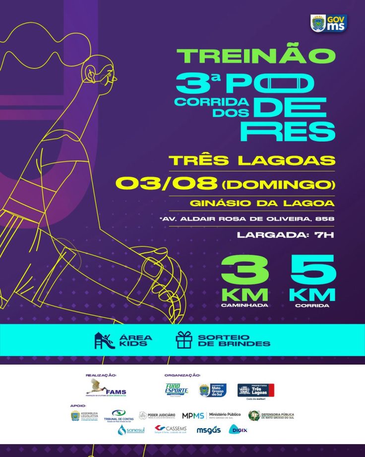 A cidade de Três Lagoas será palco, neste domingo, 03 de agosto, da Etapa Três Lagoas do Treinão dos Poderes 2025, evento gratuito que integra o calendário esportivo estadual e serve como preparação para a tradicional Corrida dos Poderes, marcada para o dia 25 de outubro, em Campo Grande.