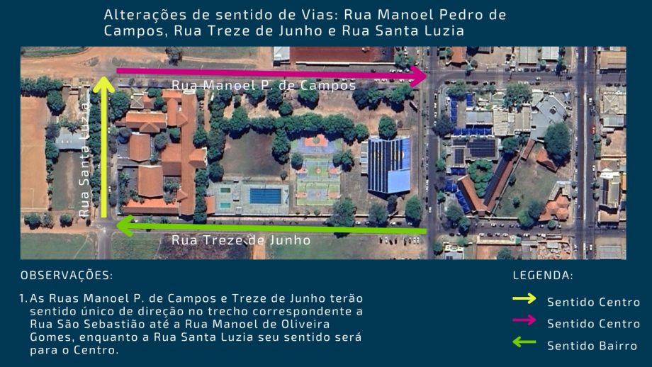 As ruas Manoel Pedro de Campos e Treze de Junho terão seu sentido de circulação alterado para via única. A mudança abrangerá o trecho compreendido entre a Rua São Sebastião e a Rua Manoel de Oliveira Gomes, já a rua Santa Luzia passará a ter sentido único em direção ao centro da cidade.
