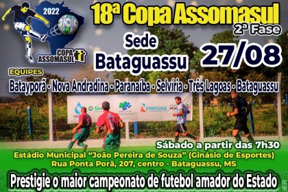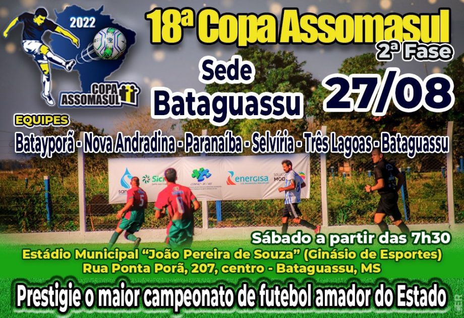 Neste sábado (27), Bataguassu sedia a 16ª etapa da 18ª edição da Copa Assomasul 2022. A competição está na 2ª fase e neste embate, Três Lagoas estará em campo na briga pela classificação, juntamente com as equipes de Batayporã, Nova Andradina, Selvíria e o time da Casa.