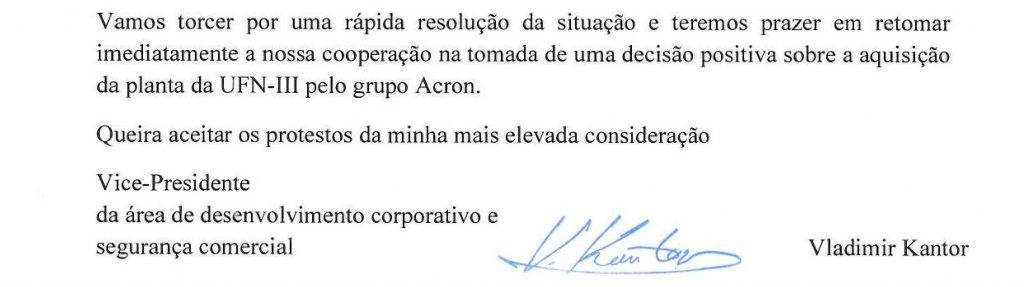 Em outro ponto do envio, Kantor deixa claro que o grupo vai torcer por uma rápida resolução. “E teremos prazer em retomar imediatamente a nossa cooperação na tomada de uma decisão positiva sobre a aquisição da planta da UFN-III”, finaliza.