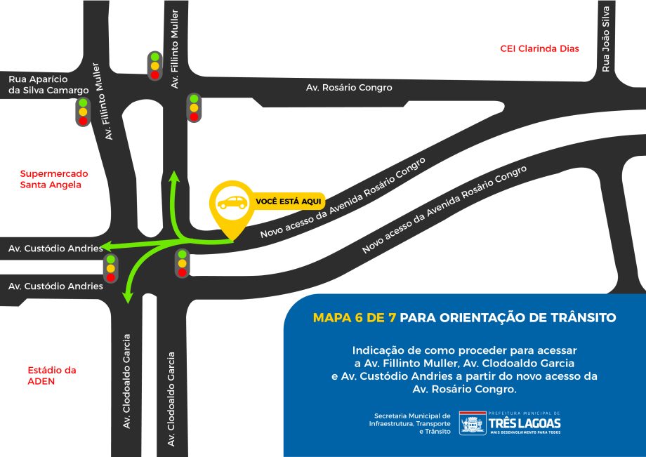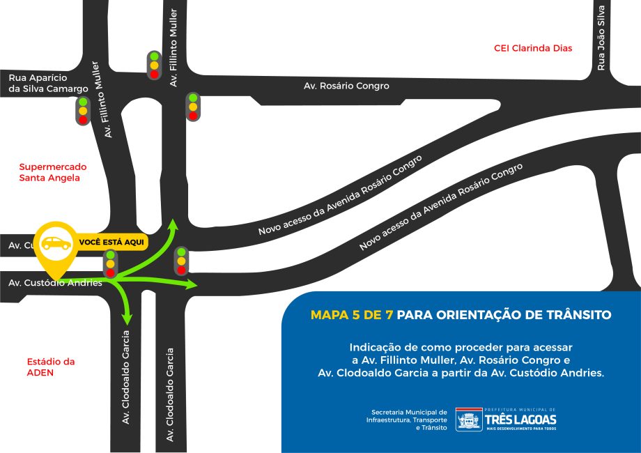 A Secretaria Municipal de Infraestrutura, Transporte e Trânsito (SEINTRA), por meio da Diretoria Municipal de Trânsito, informa que a partir de terça-feira (30/08) os novos conjuntos de semáforos instalados no cruzamento da Avenida Fillinto Muller/Avenida Clodoaldo Garcia com a Avenida Custódio Andries e da Avenida Rosário Congro com a Rua Aparício da Silva Camargo começam a operar.