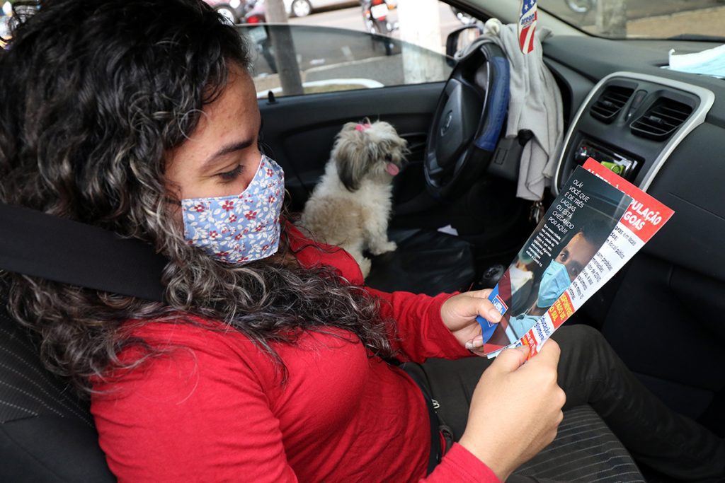 Além dos panfletos, os voluntários estão entregando máscaras aos que estão circulando sem esta proteção.