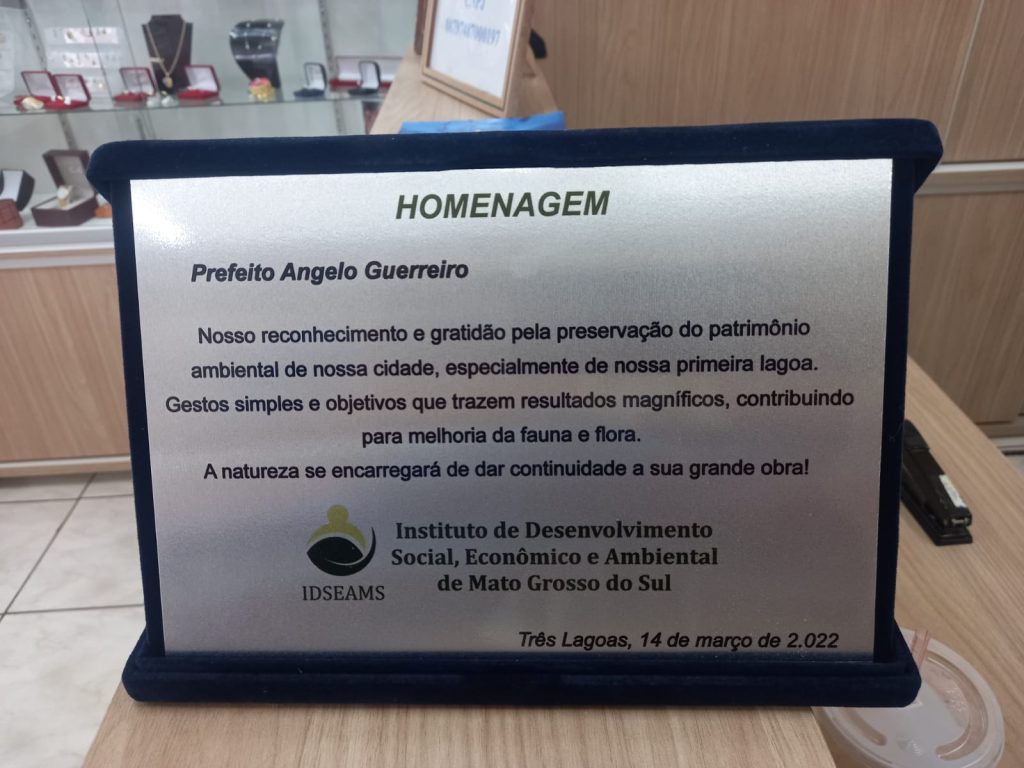 Na manhã desta quinta-feira (17), o prefeito de Três Lagoas, Angelo Guerreiro, recebeu placa de homenagem concedida pelo Instituto de Desenvolvimento Social, Econômico e Ambiental de Mato Grosso do Sul (IDSEAMS) em razão das melhorias realizadas nas primeira e segunda Lagoas.