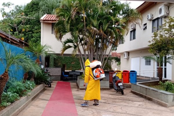 “A sanitização é feita com a aplicação de um produto, à base de cloro misturado com água, por meio de pulverização, a alta pressão, usando bombas costais”, explicou.