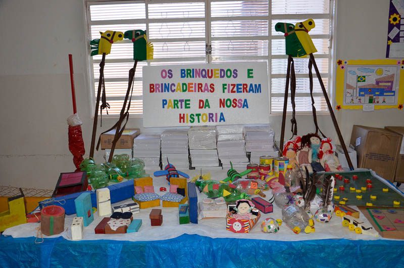Além disso, a exposição traz brinquedos antigos que os alunos confeccionaram no ano passado.