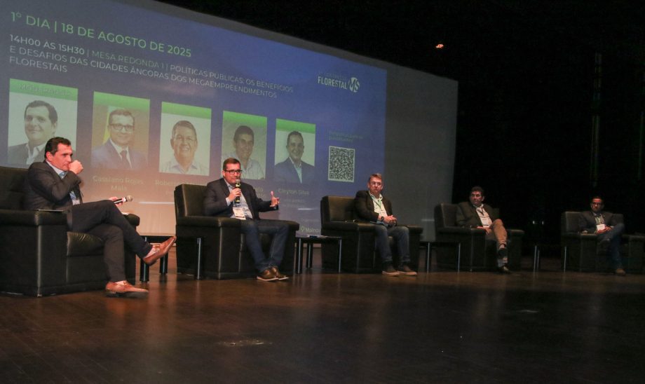 Entre os destaques do dia, o prefeito de Três Lagoas, Dr. Cassiano Rojas Maia, participou como palestrante na Mesa Redonda 1 – Políticas Públicas: os benefícios e desafios das cidades âncoras dos megaempreendimentos florestais.